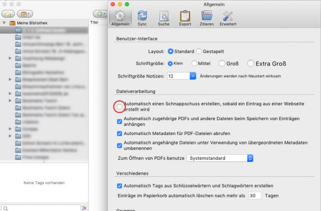 - Unter Allgemein den Hacken bei Automatisch einen Schnappschuss erstellen, sobald ein Eintrag aus einer Webseite erstellt wird entfernen (sonst macht Zotero von jeder gespeicherten Seite einen Screenshot, was sehr viel Platz beansprucht).