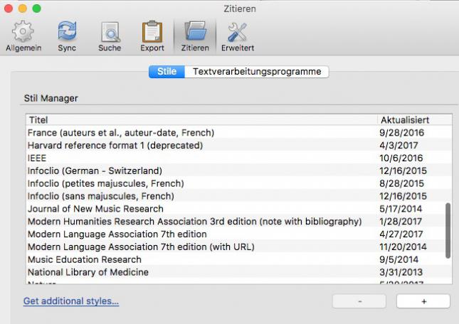 - Unter Zitieren → Stile den Stile Manager öffnen und den gewünschten Zitierstil auswählen. Durch Klicken auf das +-Zeichen kann ein neuer Zitierstil importiert werden. Um einen Zitierstil aus dem Stil-Repositorium von Zotero zu laden, den Link Get additional styles... klicken.