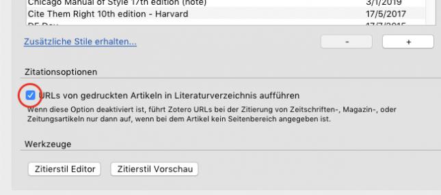 - Unter Zitationsoptionen den Hacken bei URLs von gedruckten Artikeln in Literaturverzeichnis aufführen setzen.