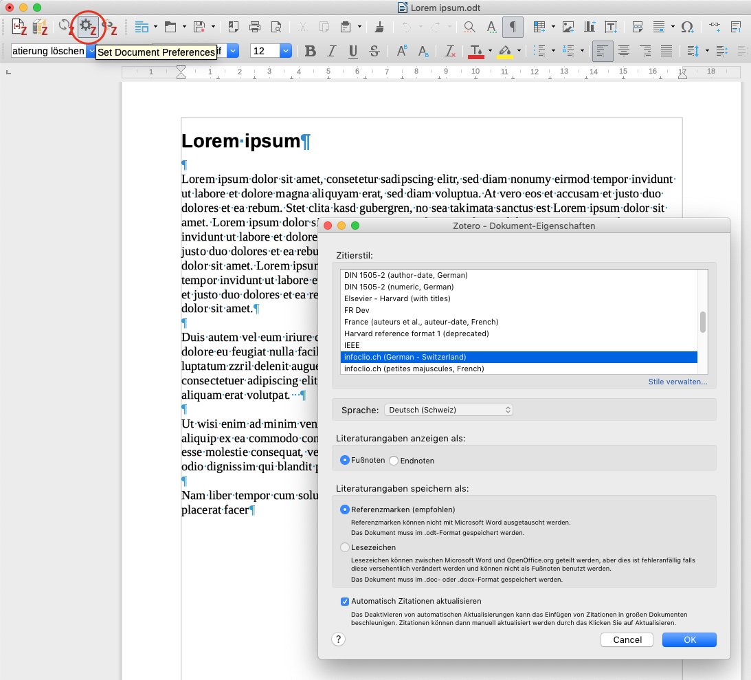 - Zitierstil einstellen. Im Zotero-Menü auf Zotero → Set Document Preferences klicken. Es erscheint ein Fenster, in dem der gewünschte Zitierstil ausgewählt werden kann.