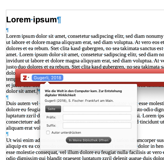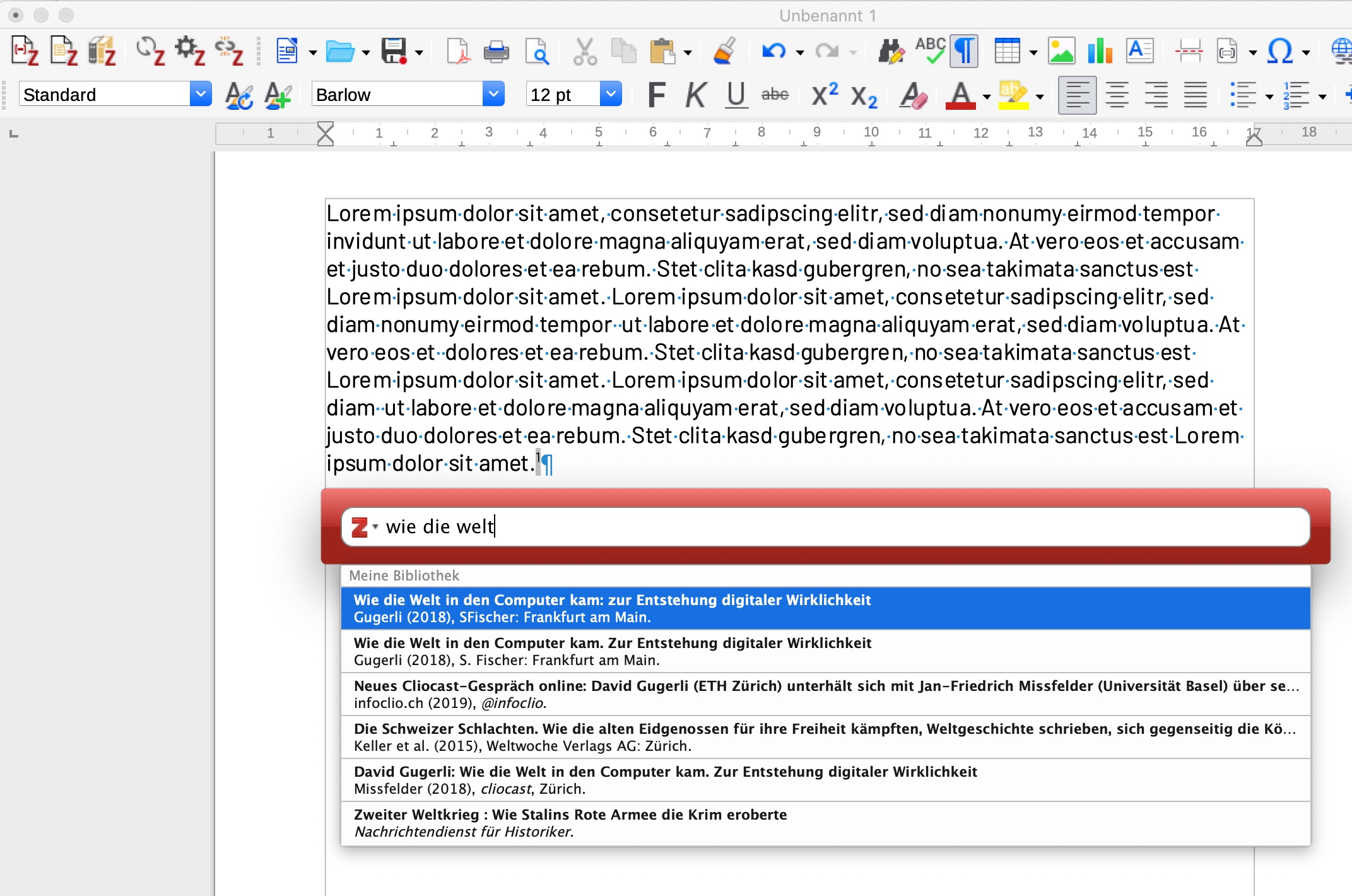 Mit dem Plugin für Microsoft Word, OpenOffice oder LibreOffice Writer kann die Literatur, die in Zotero gesammelt wurde, direkt als Fussnote in die Seminararbeit oder in einen anderen Text eingesetzt werden. Das