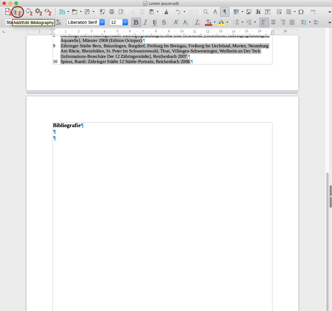 Aus allen Fussnoten, die mit Zotero erstellt wurden, kann das Programm nun automatisch ein Literaturverzeichnis erstellen. Dazu wird im Script-Menü Add Bibliography gewählt. Das Literaturverzeichnis wird automatisch erstellt.
