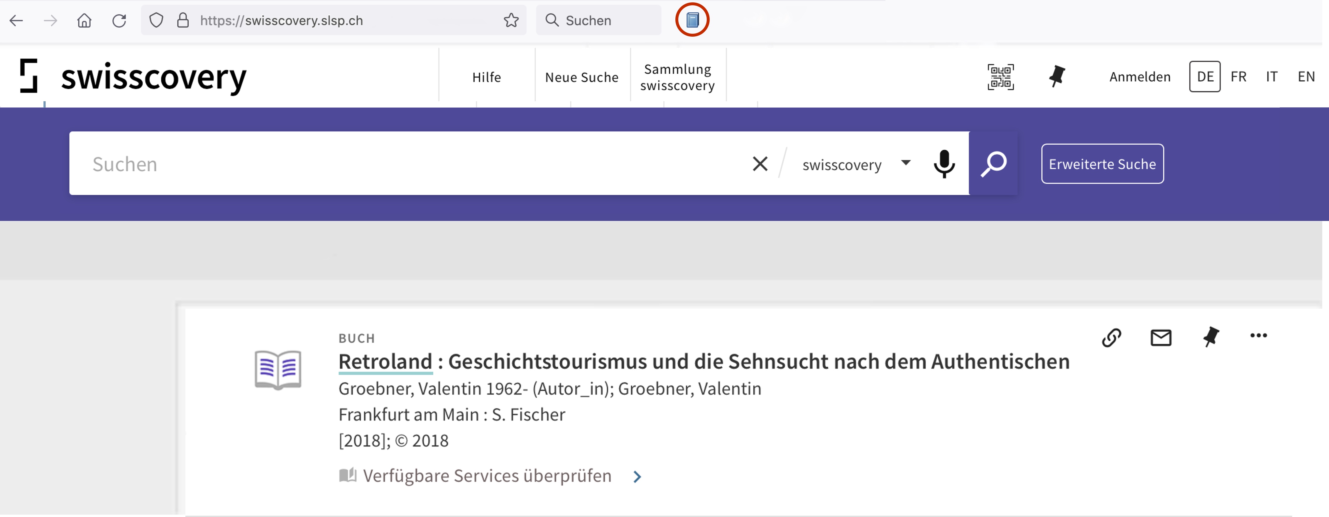 Mit Zotero lässt sich Literatur aus Bibliothekskatalogen, Buchhandlungen oder anderen Datenbanken direkt aufnehmen: Buch in einem Bibliothekskatalog suchen und dann auf das Buch-Symbol in der Adresszeile klicken.