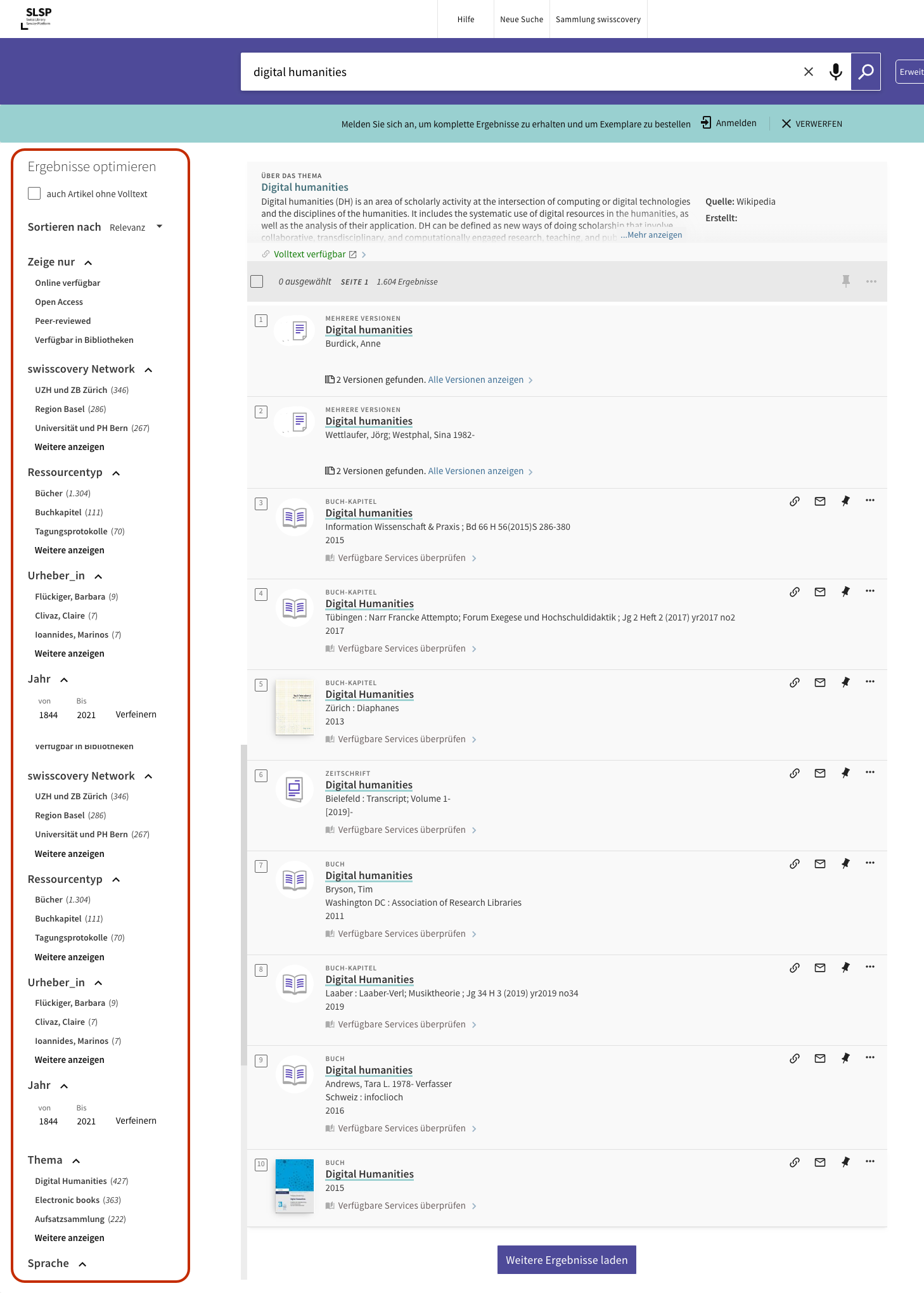 Der Suchbegriff «digital humanities» hat im Katalog von Swisscovery 1604 Resultate erzielt. Mithilfe verschiedener Facetten auf der linken Seite kann die Suche nun weiter verfeinert werden.